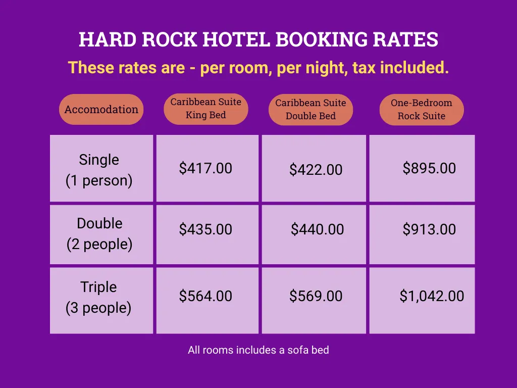Book your room at the Hard Rock Hotel and Casino Punta Cana as soon as possible. Please refer to the chart below for the complete rate details. The "Book Hotel Room" button below will be active on December 29, 2025. Our special discounted room block rate is available through July 1, 2026, or until the room block is sold out.